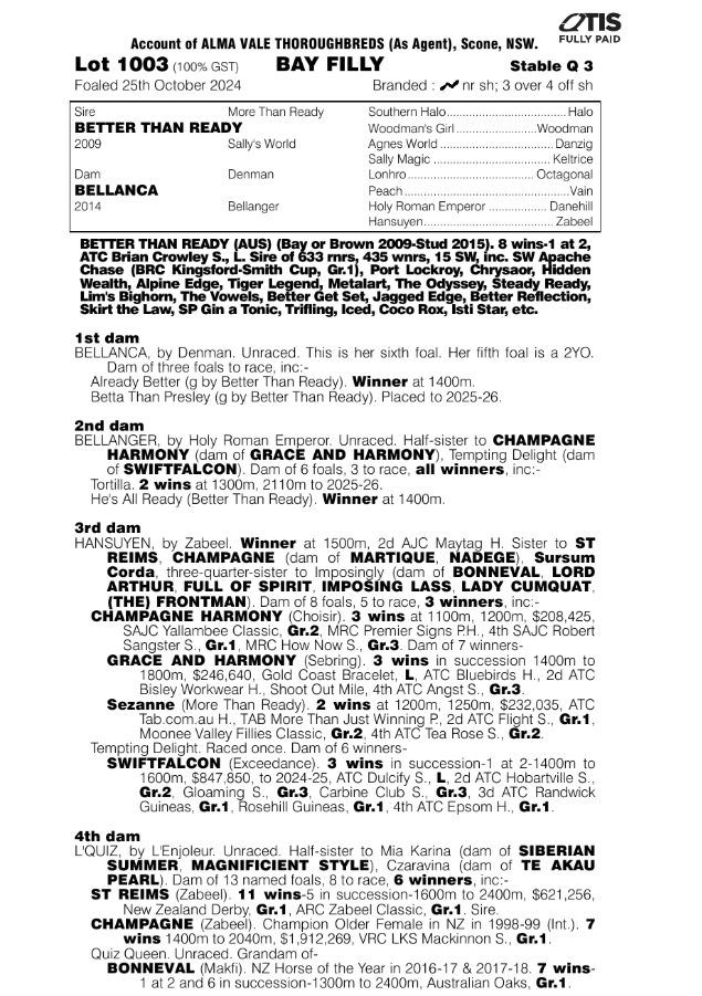 Hansuyen is one of the six winners for the high class broodmare L’Quiz, dam of the Gr.1 winners St Reims and Champagne (remembered for her close second to fellow Zabeel mare Jezabeel in the Gr.1 Melbourne Cup) and ancestress of the Gr.1 winners Charmont and Bonneval and fellow stakes winners Nadedge, Martinique, Meg, Jericho Missile, Resortman, Fitocracy, Full Of Spirit, Imposing Lass, Lady Cumquat, Frontman and Megamea.