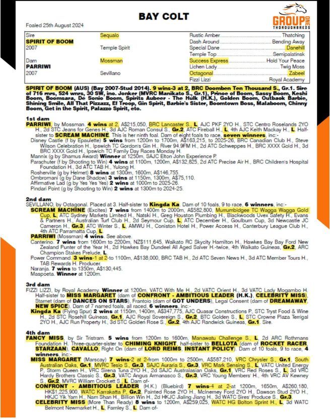 Bred by Eureka Stud the owners of champion sire Spirit of Boom and breeders behind numerous Group 1 performers including Pippie, Spirit of Boom and Tinto. This colt immediately drew high praise from our team and trainer. He presents a compact, athletic physique, exemplary conformation and a faultless, professional attitude at the sales. His correct, balanced frame and natural carriage mark him out as a colt with both physical presence and great qualities.